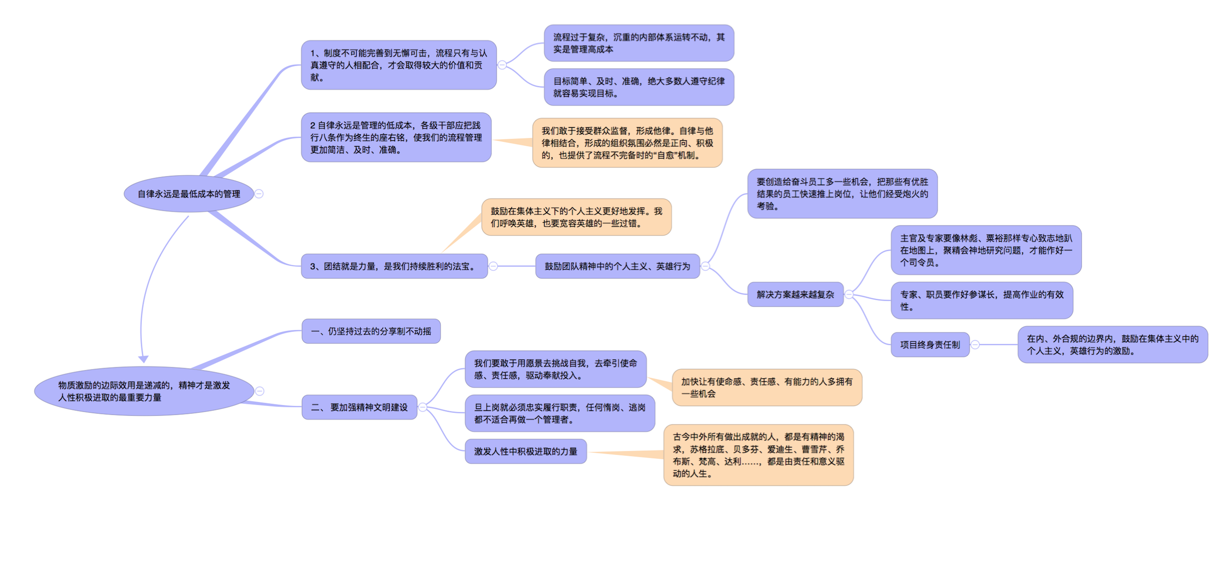 1、公司前三十年,以“獲取分享制”為基礎(chǔ)的物質(zhì)文明,促進(jìn)了精神文明,使絕大多數(shù)骨干脫離了貧困。在此基礎(chǔ)上,我們不可能以不斷增加物質(zhì)滿足的方式來(lái)牽引,因?yàn)樽霾坏剑X(qián)從哪兒來(lái)?我們一方面仍堅(jiān)持過(guò)去的分享制不動(dòng)搖,另一方面要加強(qiáng)精神文明建設(shè)。