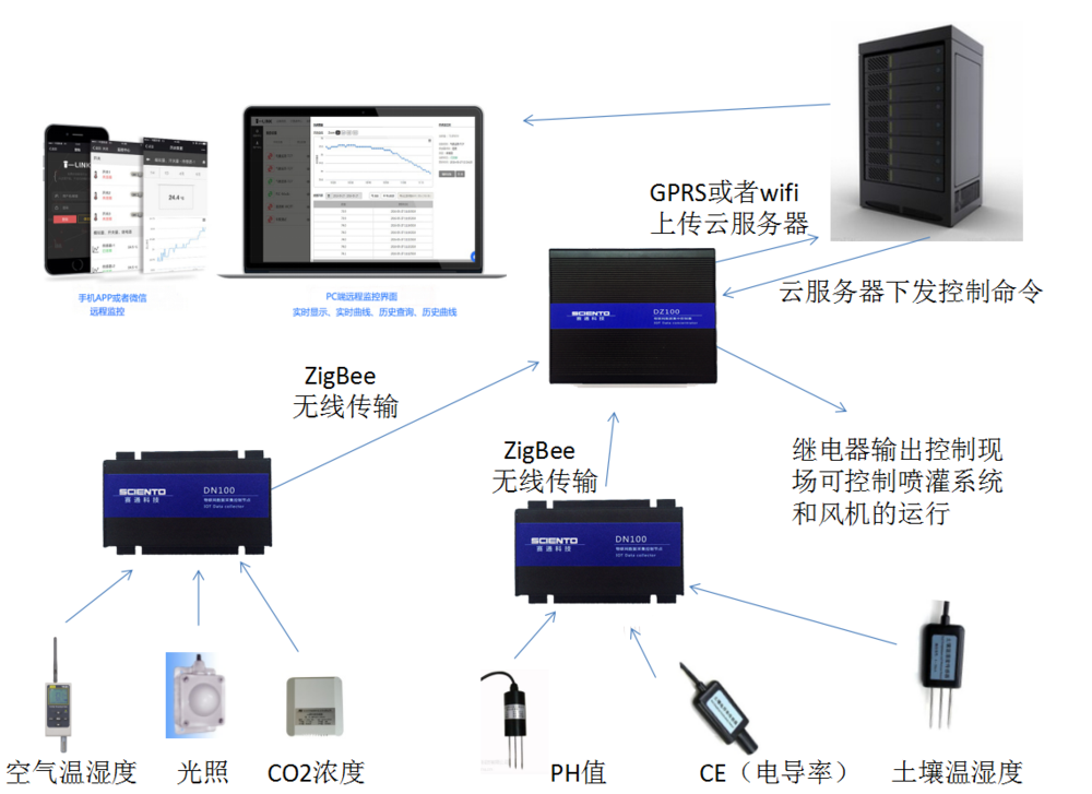 基質(zhì)墑情(PH值、電導(dǎo)率、溫濕度)、作物生長環(huán)境(空氣溫濕度、光照強(qiáng)度、CO2濃度)等采用4-20mA輸出信號(hào)傳感器,將檢測(cè)到的數(shù)據(jù)直連傳輸給DZ100-Z,ZigBee數(shù)據(jù)采集模塊,DZ100-Z將采集到的數(shù)據(jù)通過ZigBee無線的形式傳輸給DN100監(jiān)控主機(jī),DN100主機(jī)將數(shù)據(jù)進(jìn)行分析處理、記錄存儲(chǔ),并通過DN100主機(jī)內(nèi)部的繼電器輸出來控制現(xiàn)場(chǎng)的風(fēng)機(jī)的運(yùn)轉(zhuǎn)和噴灌系統(tǒng)的啟停。