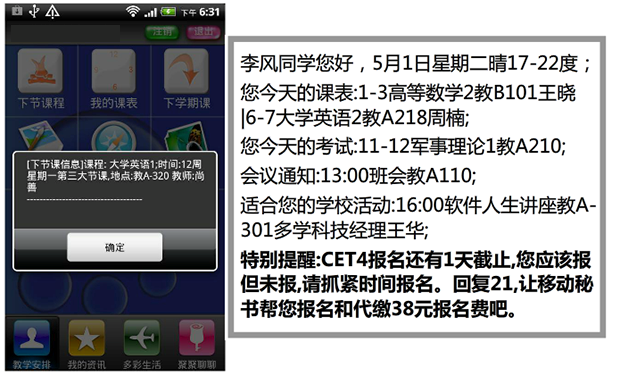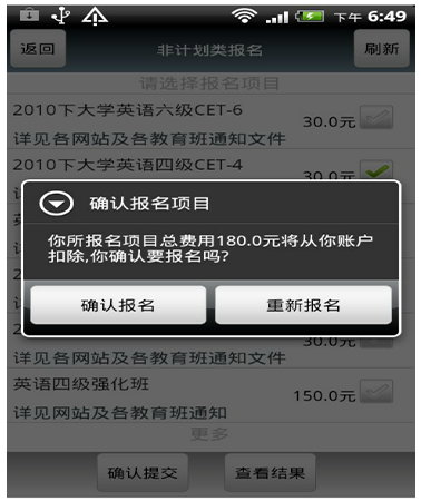 如:教務(wù)處用WEB報(bào)名通知子系統(tǒng)發(fā)送報(bào)名通知到每個(gè)尚未通過(guò)計(jì)算機(jī)等級(jí)考試的學(xué)生,學(xué)生看到報(bào)名短信后用手機(jī)報(bào)名扣費(fèi),經(jīng)過(guò)選擇項(xiàng)目及確認(rèn),完成報(bào)名。