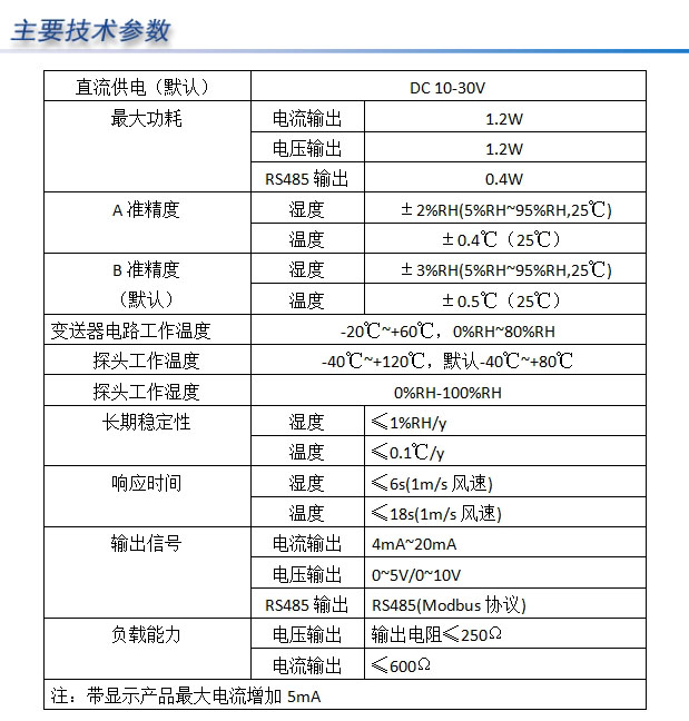 本溫濕度變送器采用銅顆粒燒結(jié)溫濕度傳感器護套,溫濕度傳感器與殼體直接相連外觀美觀大方。輸出信號類型分為RS485\4-20mA\0-5V\0-10V等。詳見選型表。