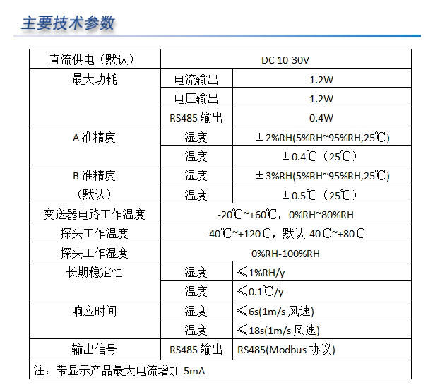 本溫濕度變送器采用銅顆粒燒結(jié)溫濕度傳感器護(hù)套,溫濕度傳感器與殼體直接相連外觀美觀大方。輸出信號(hào)為RS485輸出。