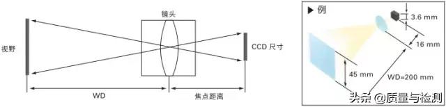 WD 和視野的大小由鏡頭的焦點距離和 CCD 的尺寸來決定。例如:焦點距離為 16 mm 鏡頭、CCD 尺寸 3.6 mm 時,如果想把視野設為 45 mm,則 WD 變為 200 mm。