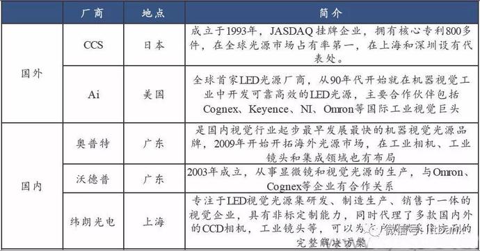光源是國產化最充分環節。光源的好壞在于對比度、亮度和對位置變化的敏感程度,機器視覺行業主要采用LED 光源產品。目前沒有通用的機器視覺照明設備,針對每個特定的應用實例有個性化的方案,以達到最佳效果 。目前光源行業國產化程度高,競爭比較激烈。