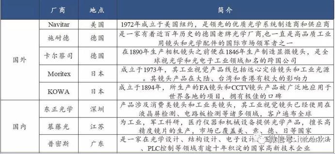 低端鏡頭國內企業具備一定競爭力,高端鏡頭基本依賴進口。鏡頭的基本功能是實現光束調制,將目標成像在圖像傳感器的光敏面上完成信號傳遞。工業鏡頭主要可以分為定焦鏡頭、定倍鏡頭、遠心鏡頭、連續變倍鏡頭等,不同的鏡頭根據要求應用于不同的工業現場,價格差距也較大。