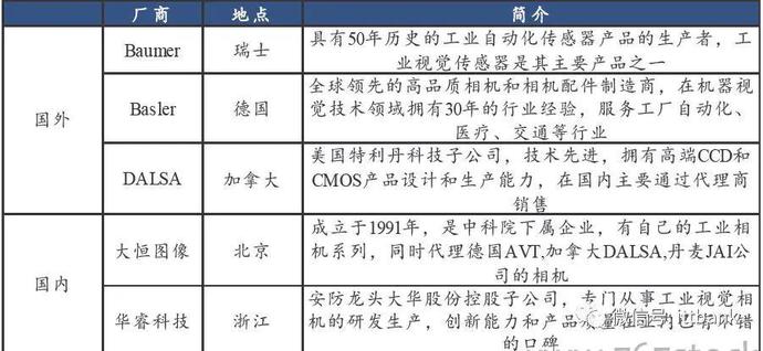 工業相機以歐美進口為主,國產品牌從低端市場開始逐步進口替代。工業相機是工業視覺系統的核心部件,其本質功能完成是將光信號轉變成電信號的過程,要求更高的傳輸力、抗干擾力以及穩定的成像能力。