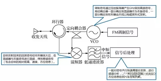 FMCW雷達系統主要包括收發天線、射頻前端、調制信號、信號處理模塊等。毫米波雷達通過接收信號和發射信號的相關處理實現對目標的探測距離、方位、相對速度。