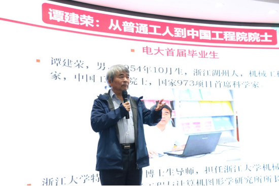 譚建榮分享了自身年輕時期的學習、工作經(jīng)歷,介紹自己出生于動蕩年代,初中畢業(yè)后因為特殊時期“求學無門”,做了15年的技術(shù)工人,在中央廣播電視大學開始招生之時,把握住了這彌足珍貴的機會,成為電大的首屆學生。三年時間里他一口氣修完機械工程和電子工程兩個專業(yè)的課程。“不斷學習和不斷提高是人生永恒的主題”,他說,電大課堂上樹立起來的求實學風對他有著深遠影響。譚建榮以蘇步青、華羅庚等科學家的人生經(jīng)歷詮釋了實事求是的科研態(tài)度;用自己的座右銘、諸葛亮的《誡子書》和王國維《人間詞話》,叮囑在場師生們在生活和學習中要肯努力、肯勤奮、肯吃苦,以創(chuàng)新和拼搏精神贏得出彩人生。譚院士結(jié)合自身經(jīng)歷,旁征博引,從不同的角度與層次闡述了自己對終身學習的理解,引起現(xiàn)場師生的強烈共鳴和深刻思考。