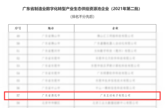 近日,廣東省制造業(yè)數(shù)字化轉(zhuǎn)型產(chǎn)業(yè)生態(tài)供給資源池企業(yè)(2021年第二批)評(píng)審結(jié)果公示,廣東互動(dòng)電子有限公司憑借出色的產(chǎn)品技術(shù)、優(yōu)秀的服務(wù)案例成功入選。