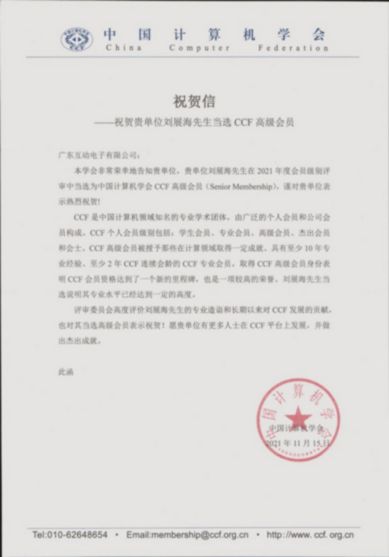 近日,我司收到來自中國計算機學會的祝賀信,謹對我司總經(jīng)理在2021年度會員級別評審中當選為中國計算機學會CCF高級會員,表示熱烈祝賀!