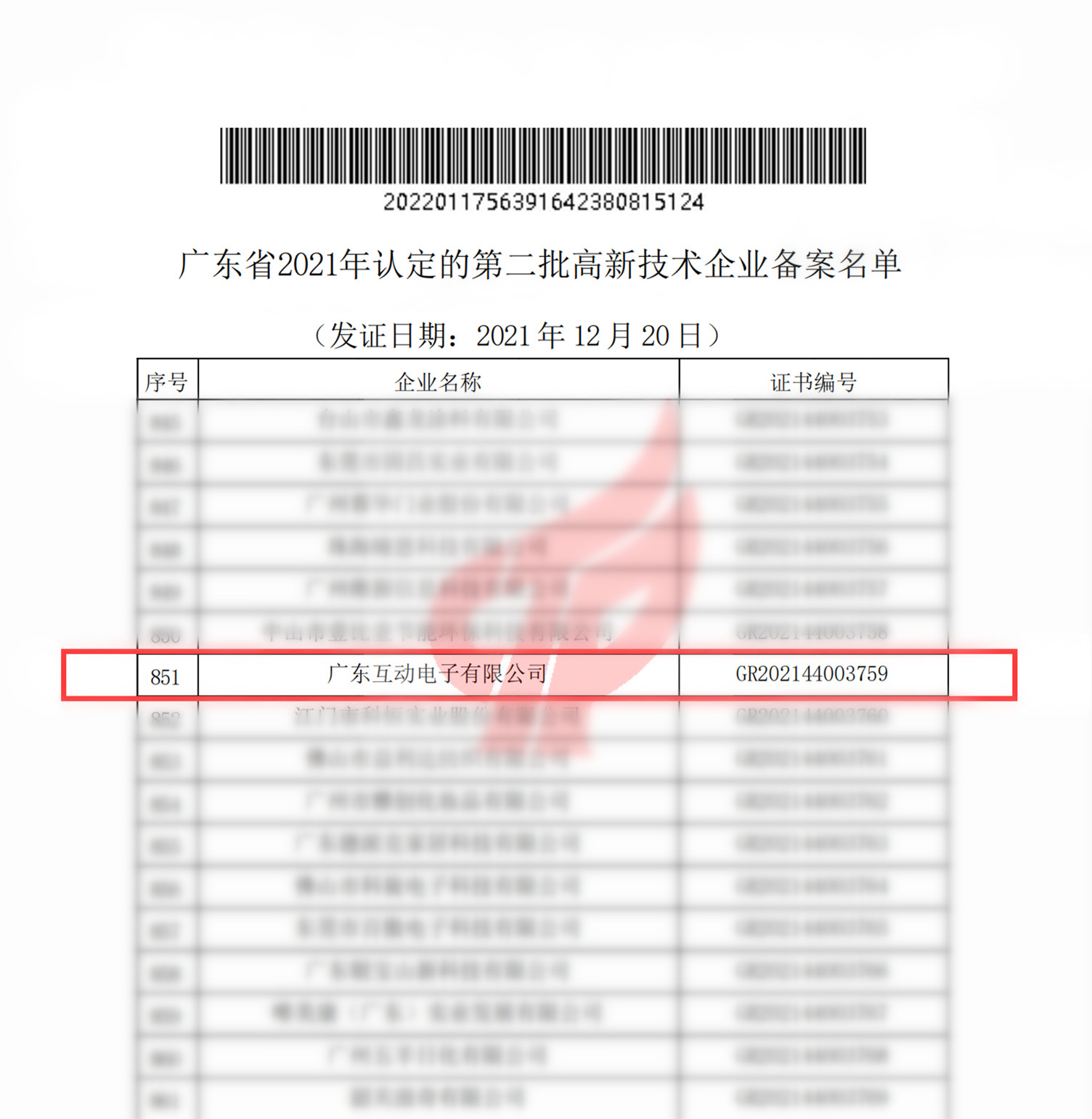 近日,從全國高新技術企業認定管理工作領導小組辦公室發出“關于對廣東省2021年認定的第二批高新技術企業進行備案公告”悉知,我司廣東互動電子有限公司再次順利通過高新技術企業認定管理工作,被認定為“高新技術企業”。這是繼2018年我公司被認定為“高新技術企業”之后,第二次順利通過高新技術企業。這是我司堅持以科技為先導,以創新為動力所取得的一項重大發展成果。該項成果的取得,不僅是我公司長期堅持技術創新的有力詮釋,同時也代表著我公司具備自主創新的科技研發實力。