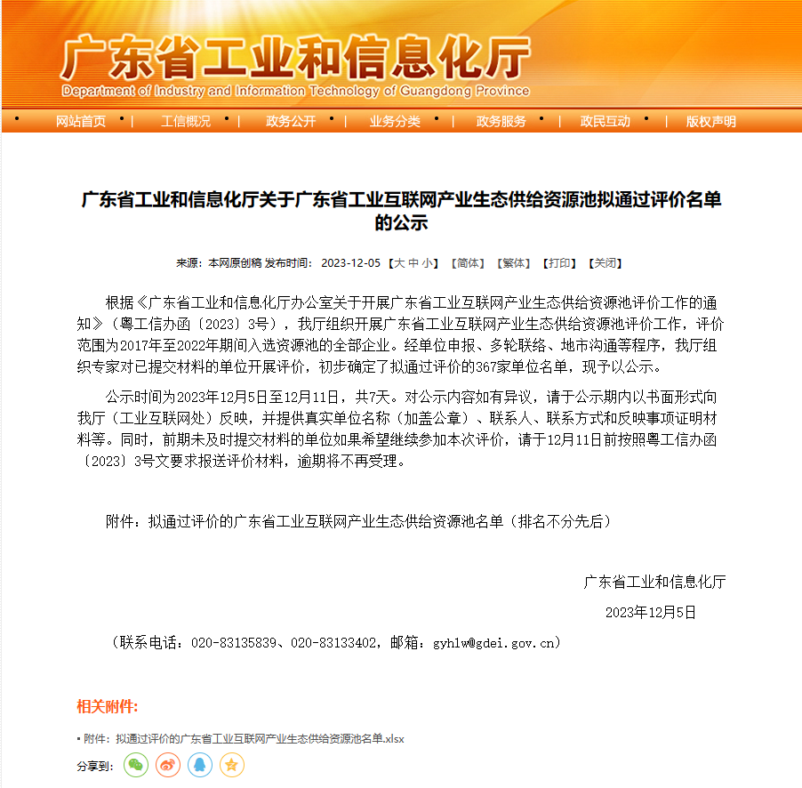 近日,從廣東省工業互聯網產業生態供給資源池擬通過評價名單公示悉知:我司成功通過廣東省工業互聯網產業生態供給資源池評價。